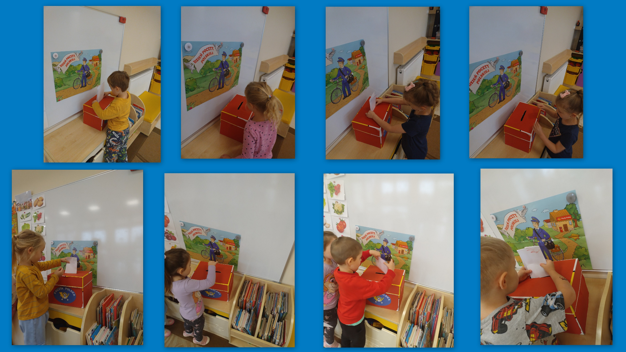 W ten dzień poznaliśmy pracę listonosza, funkcjonowanie poczty, jaką drogę pokonuje list od nadawcy do adresata. Każdy przygotował list dla kolegi/koleżanki z grupy i wrzucił do skrzynki pocztowej. Następnie listonosz rozniósł listy wszystkim dzieciom.
